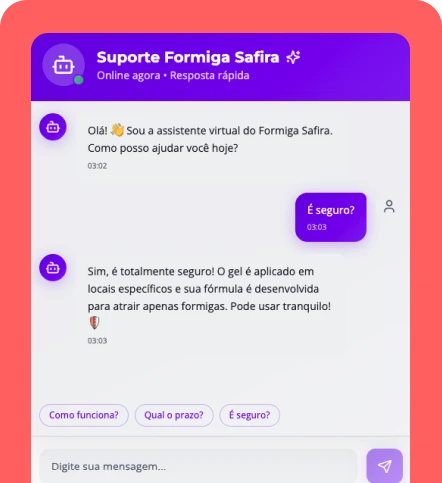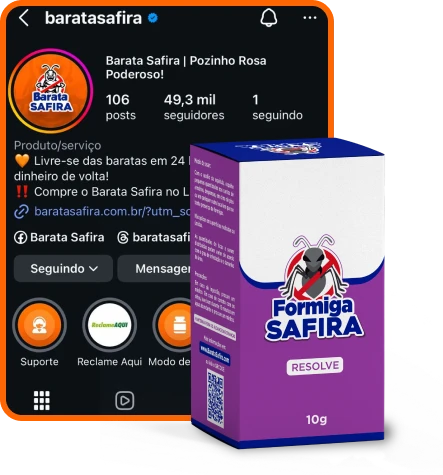 Use o Formiga Safira seguindo o passo a passo. Se em até 30 dias você não notar redução clara das trilhas de formigas nos pontos onde aplicou, reembolsaremos seu dinheiro todo de volta!.